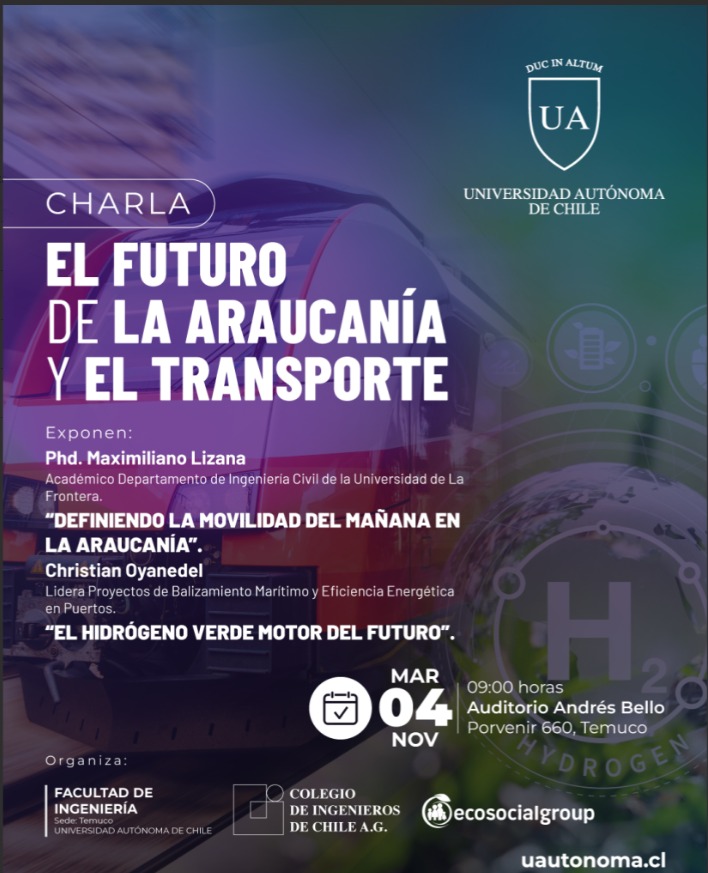 La jornada incluyó las exposiciones de Maximiliano Lizana, académico del Departamento de Ingeniería Civil de la Universidad de La Frontera, y de Christian Oyanedel, líder de proyectos de balizamiento marítimo y eficiencia energética. Se abordaron las principales problemáticas que afectan al transporte en la Araucanía, así como los escenarios y posibilidades que podrían impulsar su desarrollo sostenible en los próximos años.